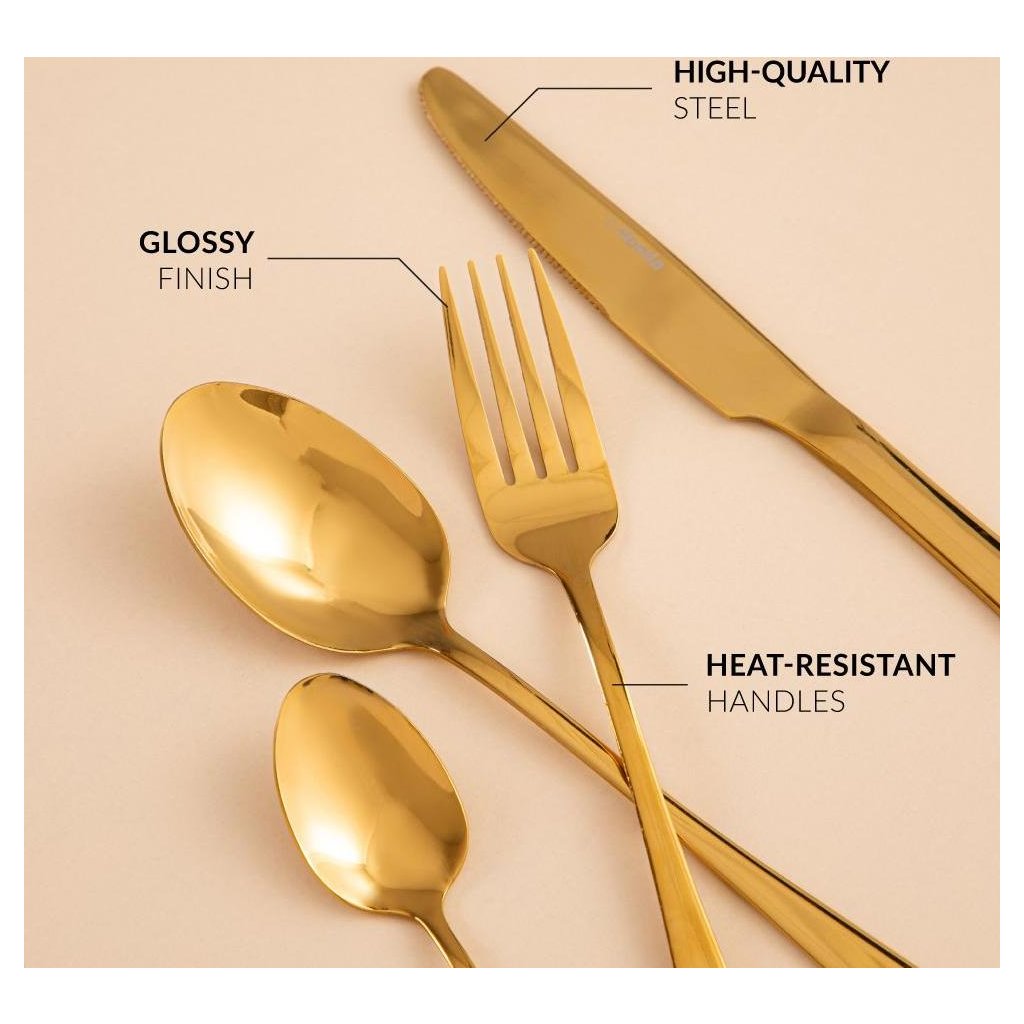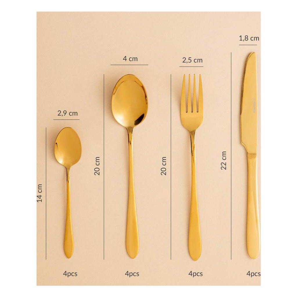 - Příbory obsahují: čtyři nože ( 23 cm ), čtyři lžíce ( 20 cm ), čtyři vidličky ( 20 cm ), čtyři čajové lžičky ( 13 cm ). Každý prvek je vyroben v klasické zlaté barvě s leštěným, lesklým povrchem, který dokonale ladí se světlem. ABELE se vyznačují klasickými, elegantními tvary a jsou ideální jak pro každodenní použití, tak pro sváteční aranžmá.